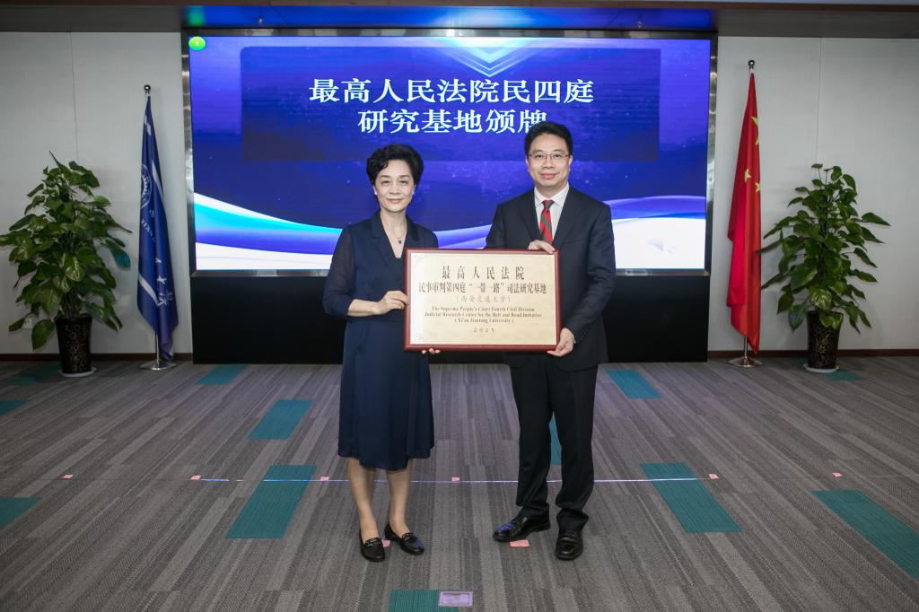 启动活动结束后,最高人民法院陶凯元副院长分别为15家研究基地颁牌。为深入学习贯彻习近平法治思想,全面推进依法治国,统筹推进国内法治和涉外法治,充分发挥高等院校、科研机构的研究优势,促进法学教育与司法实践的深度融合,实现优势互补、资源共享、发展共赢,最高人民法院民四庭在全国高校和科研机构中遴选出15家院校和机构建立了相应的研究基地。B体育官网平台作为最高人民法院民四庭全国15家研究基地之一,被授予最高人民法院民四庭“一带一路”司法研究基地。