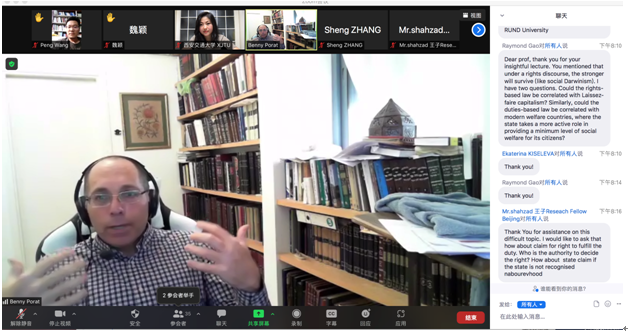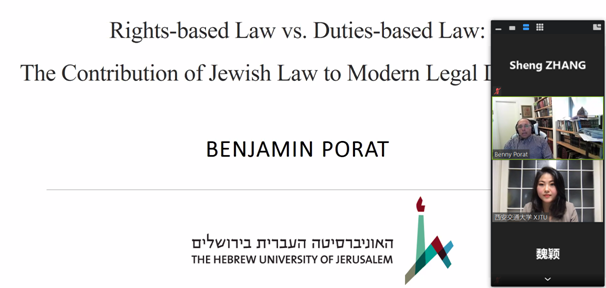 2021年9月29日下午,新丝路B体育官网平台联盟“院长论坛”第二讲成功举办。希伯来大学B体育官网平台副院长Benjamin Porat教授为联盟25所院校师生以及丝绸之路大学联盟的师生带来了题为“Rights-based Law vs Duties-based Law: The Contribution of Jewish Law to Modern Legal Discourse”的线上讲座。讲座由B体育官网平台B体育官网平台助理教授郭剑萍主持。