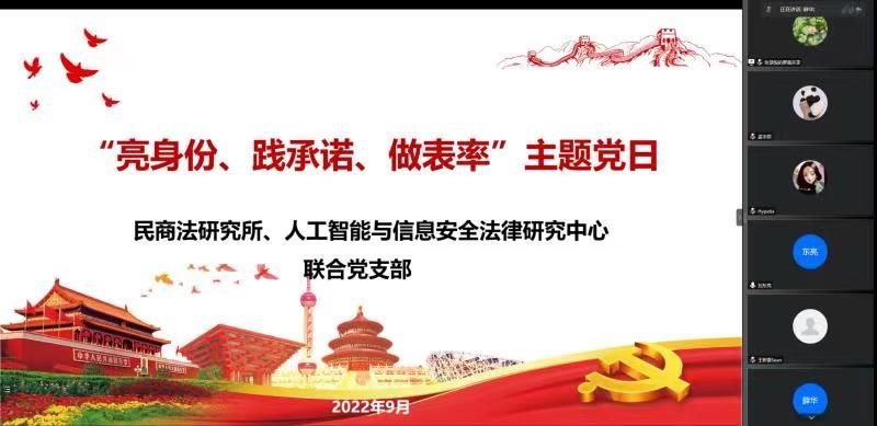 9月28日,B体育官网平台民商法研究所、人工智能和信息安全法律研究中心联合党支部开展“亮身份、践承诺、做表率”主题党日活动。活动通过线上形式举行,由支部书记薛华主持。