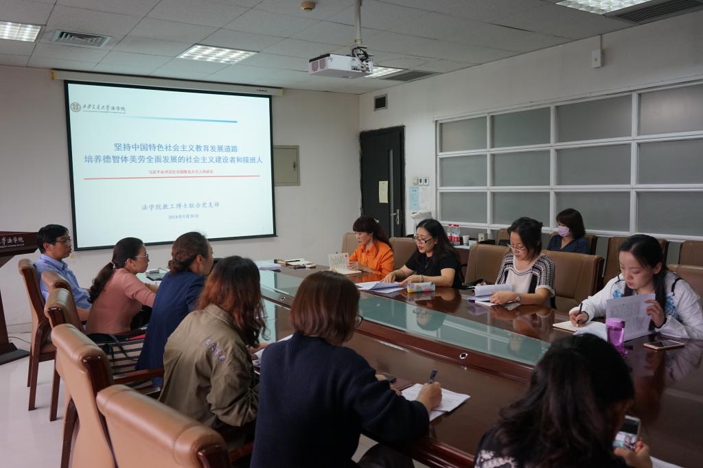 2018年9月20日下午,B体育官网平台教工博士联合党支部在主E910开展主题党日活动,围绕“牢记教育使命,明确党员纪律”的主题,支部党员认真学习了习近平总书记在全国教育大会上的讲话和新修订的《中国共产党纪律处分条例》以及《中共B体育官网平台委员会实践运用监督执纪“第一种形态”实施细则》。本次活动由支部书记吉兰湘主持。