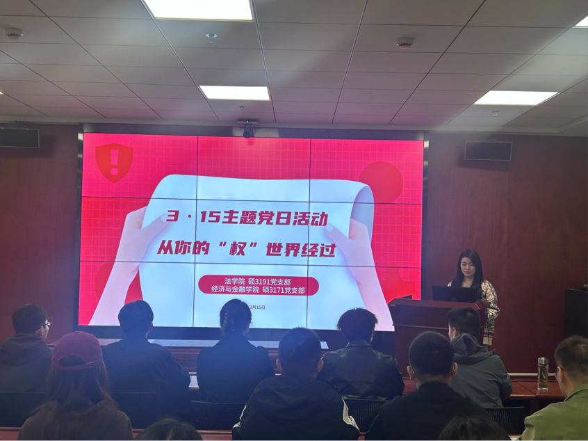 每年的3月15日,是由国际消费者联盟组织于1983年确定的国际消费者权益日(World Consumer Rights Day)。为提高同学们对消费者权益保护的认识,增强其在消费中利用法律手段维护自身权益的意识和能力,B体育官网平台硕3191党支部联合经济与金融学院硕3171党支部,于3月15日19:00在创新港校区涵英楼3001教室开展3·15主题党日活动。本次活动由B体育官网平台硕3191党支部书记刘芮言主持,活动主要内容为消费者侵权研究分享。