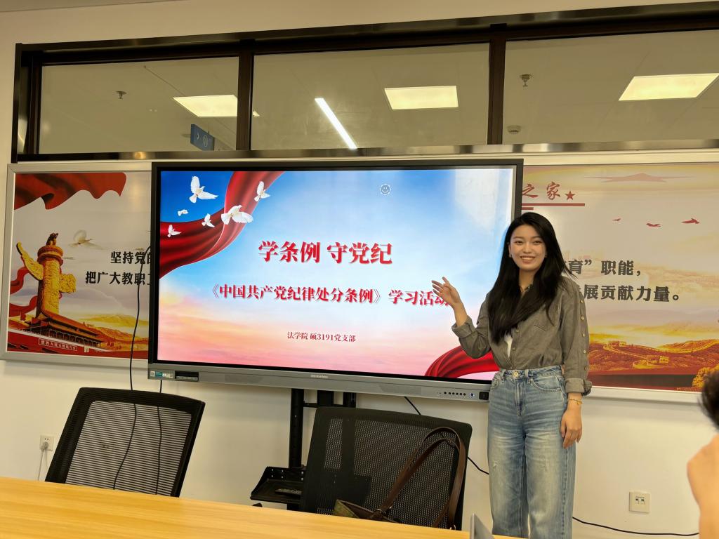 为深入学习贯彻习近平总书记关于党纪学习教育的重要讲话和重要指示精神,引导广大党员干部学纪、知纪、明纪、守纪,自觉用党规党纪校正思想和行动,帮助支部内党员同志深入学习理解、贯彻执行好《条例》,2024年4月25日下午,B体育官网平台硕3191党支部全体党员于涵英楼5-3001开展了题为“学条例·守党纪”的《中国共产党纪律处分条例》学习活动。