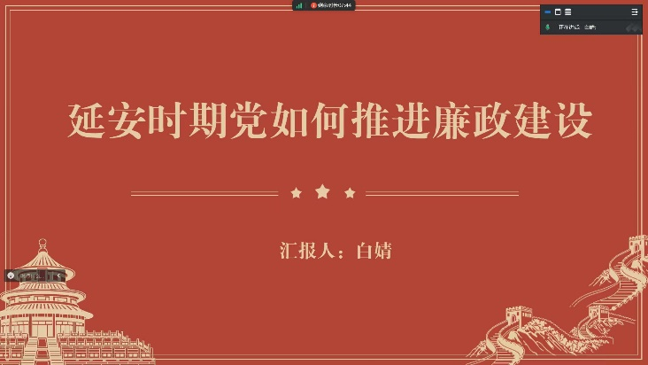 白婧同志为大家带来了以“延安时期党如何推进廉政建设”为主题的分享,她从“思想教育”、“法规制度”、“监督制度”以及“奖惩制度”四个方面进行内容讲解。始终保持清正廉洁是共产党人的政治本色。延安时期,我们党着眼于局部执政的实践要求,为预防腐败侵蚀党的健康肌体、巩固党的执政安全,把廉政建设摆在重要位置,采取一系列举措,开创了一条适合当时需要的廉政建设道路并取得卓越成效,使公务人员不愿腐、不能腐、不敢腐、不易腐,形成贪污腐化可耻、廉洁奉公光荣的廉政文化氛围,塑造了中国共产党为民、务实、清廉的崇高形象。了解历史是为了指导现实、激励来者和教育后人。她认为,延安时期的反腐倡廉思想和实践的丰富内涵,今天仍然值得我们学习和借鉴!