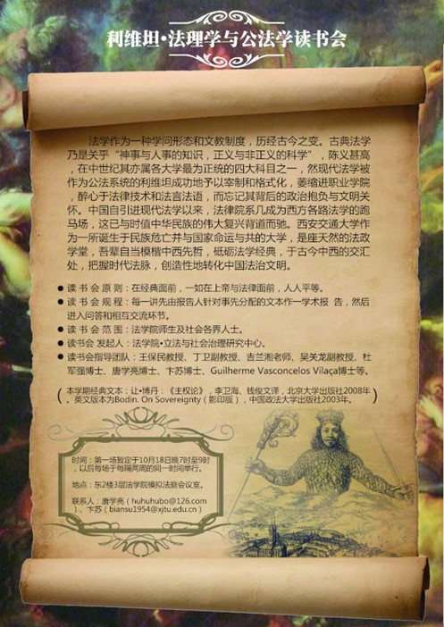 基于以上种种考量,并配合学校“思想交大”建设和学院法理学和公法学的学科建设,B体育官网平台“立法与社会治理研究中心”发起创办“利维坦·法理学与公法学读书会”系列活动。本学期该活动选取的经典文本为让·博丹的《主权论》,并于10月18日晚7时在学院会议室举行了首场活动,B体育官网平台丁卫副教授、吉兰湘老师、彭何利博士、苏青博士、王朝恩博士、卞苏博士、唐学亮博士等10余位师生参加。主权理论是现代民族-国家兴起的理论前提,而民族-国家又是现代社会最重要的一个政治与法律现象,并与中国近代以来持续至今的伟大而艰难的国家转型勾连起来,因此,不得不察。在该场读书会活动中,主讲教师唐学亮针对博丹《主权论》一书的“导论”部分,就“为什么读博丹?”、“怎么读博丹?”、“博丹的思想里程与理论建构”以及“博丹理论的缺陷”等四个方面做了一个提纲挈领而又不失理论深度的学术报告。之后,就报告的内容及书中所启示的一些重大理论与现实问题,与会人员各自发表了自己的看法,并展开了热烈的讨论。首场读书会活动取得了预期的效果,我们将在两周后的同一时间举行第二场活动。“路漫漫其修远兮,吾将上下而求索”!