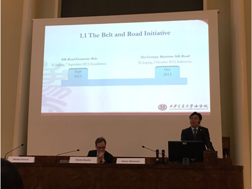 会上,会议东道主代表赫尔辛基大学副校长Anna Mauranen、B体育官网平台院长Kimmo Nuotio、亚历山大研究中心主任Markku Kivinen、社会科学学院院长Hannu Nieminen先后致辞。我校校长助理单文华教授在会议开幕式上做了题为《一带一路倡议与法律的角色》的主旨报告。在报告中,他从一带一路概念的提出和逐渐清晰化出发,分析了一带一路倡议背后的元动力和深刻意蕴,通过对一带一路建设所面临的多重挑战和广泛合作基础的解析,指出法治建设在一带一路发展中的重要地位并探讨了以法治促进一带一路建设的路径选择问题。单教授的主旨报告引起了与会专家的广泛回应和热烈讨论。