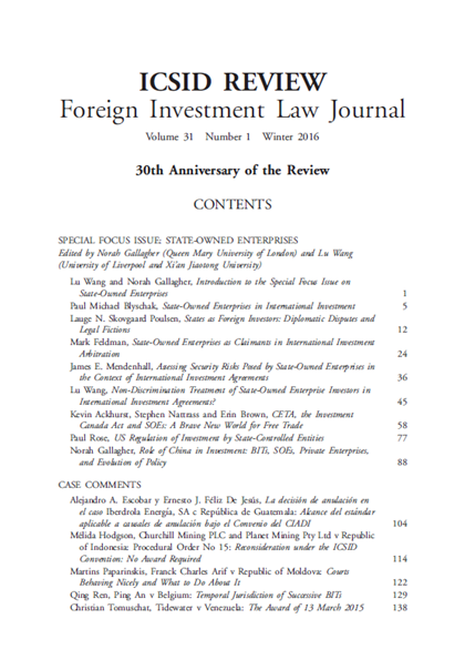 近日,国际投资法领域顶级专业期刊ICSID Review—Foreign Investment Law Journal(《国际投资争端解决中心评论——外国投资法学刊》)三十周年纪念期刊第一期正式出版,西安交大B体育官网平台博士生王璐作为特邀编辑(Guest Editor)主编了本期特别专栏“国有企业专题研究”(Special Focus Issue on State-Owned Enterprises),并发表论文 “Non-Discrimination Treatment of State-Owned Enterprise Investors in International Investment Agreements?”(国际投资协定中国有企业投资者的非歧视待遇?)。