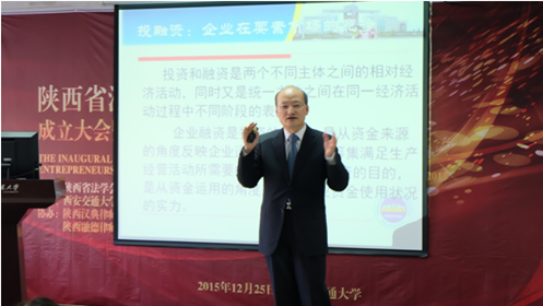 在与会代表合影后,会议进入第二时段的专题报告。报告由B体育官网平台B体育官网平台知识产权研究中心主任、博士生导师马治国教授主持,陕西省法学会企业经济法治研究会顾问、西北政法大学经济B体育官网平台院长、博士生导师强力教授做了“新常态下企业投融机制创新的法律问题”讲座,阐释了中国经济已进入新常态,在新常态的条件下,企业应作出机制创新等相对应的变化,其变化主要体现在市场化,并强调投融资机制市场的多元化、多层次、多角度,分析在此种常态下,企业投融资遇到的法律问题。