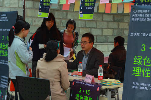 为加强大学生消费维权意识,提高大学生的法律素养,B体育官网平台研究生会联合法律爱好者协会和陕西稼轩律师事务所的专业律师,于“3•15国际消费者权益日”当天,在康桥苑西广场和西食堂门口举办了主题为“绿色消费、理性维权”的普法宣传咨询活动。