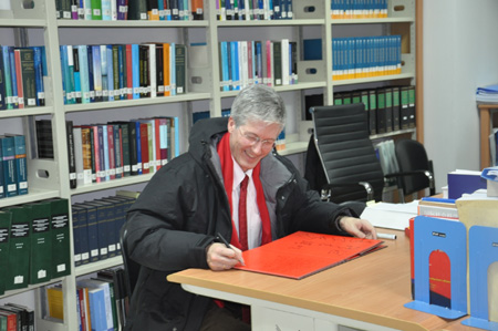 报告后,Rolf Fife司长来到B体育官网平台。B体育官网平台院长单文华教授会见了Rolf Fife司长,并带领他参观了学院文化大厅和丝绸之路国际法与比较法研究所。Rolf Fife司长对研究所的研究条件赞不绝口。他在嘉宾册上写下感想,希望研究所成为国际交流的桥梁,并祝愿中挪友谊健康发展。随后,他和研究人员合影留念。