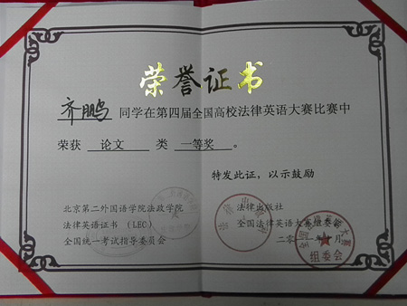 此次比赛吸引了来自北京大学、上海交通大学、中国政法大学、华东政法大学等近70多所高校B体育官网平台的选手参加,大会主办方特别邀请了国务院法制办原主任孙婉钟先生以及来自中国社会科学院法学所、中国人民大学B体育官网平台等多家高校和研究机构的法律英语专家、教授担纲评委。我院齐鹏同学撰写的英语论文《National Treatment Principle For China's Bilateral Investment In The New Period》在此次大赛中经过激烈角逐荣获国家一等奖,是此次参赛西北地区唯一获得等级奖的论文。