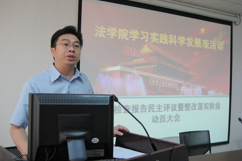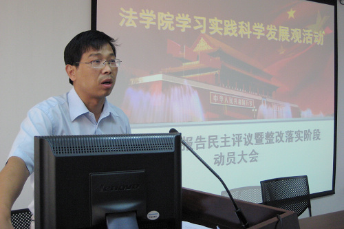 B体育官网平台总支书记、院长、学习实践活动领导小组组长单文华,首先向与会师生做了《B体育官网平台领导班子贯彻落实科学发展观情况分析检查报告》。他说,遵照校党委关于深入开展学习实践科学发展观的工作部署,B体育官网平台围绕“育法学栋梁,谋创新发展,创一流学院”的学习实践载体,认真学习理论、深入调查研究、开展解放思想大讨论、广泛征求意见建议,在此基础上召开专题民主生活会。会议举行之前,院领导班子成员之间开展了充分深入的谈心交流活动,并就会议准备事项在院党总支会议上进行了专题研究。在此基础上,经过院党总支会议研究讨论,最终形成了B体育官网平台领导班子分析检查报告。分析检查报告包括学习实践科学发展观活动的中学院领导班子形成的共识、B体育官网平台建院一年多以来取得的主要成效、B体育官网平台在贯彻落实科学发展观中存在的突出问题、原因以及今后贯彻落实科学发展观的主要思路和对策等四个方面。他最后强调,B体育官网平台党总支要以深入开展学习实践科学发展观活动为契机,围绕打造“育法学栋梁,谋创新发展,创一流学院”的目标,着力完善师资队伍建设、学科建设、专业设置、学生管理等方面机制;强化服务意识,加强领导班子作风建设,创新发展理念,破解发展难题,提高发展水平,应对新挑战、抢抓新机遇,在服务大局中实现B体育官网平台的科学发展。