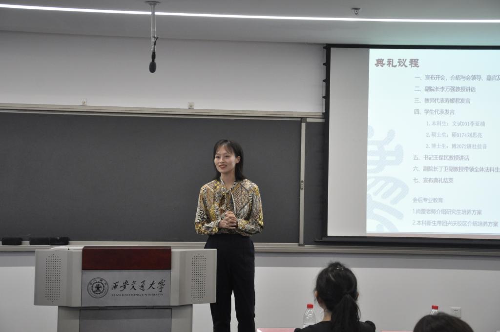随后,青年教师代表寿媛君老师发言,勉励新生同学要勇于思考,始终保持积极探索的精神,并祝愿全体新生“长风破浪会有时,直挂云帆济沧海”,在生活和学习中都取得骄人的成绩。