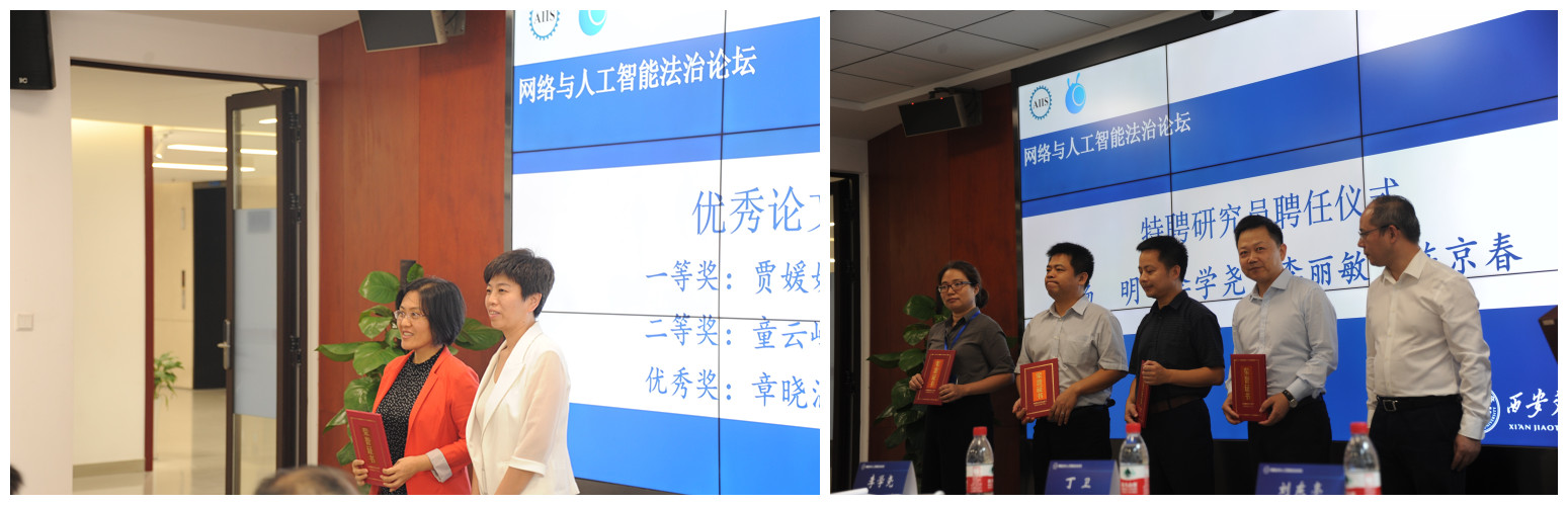 在此次论坛上,B体育官网平台人工智能与信息安全法律研究中心聘请杨明教授、李学尧教授、李丽敏教授、陈京春教授为特聘研究员并为其颁发了聘书。B体育官网平台学报(社会科学版)张丛副主编为评选出的优秀论文作者代表进行了颁奖。