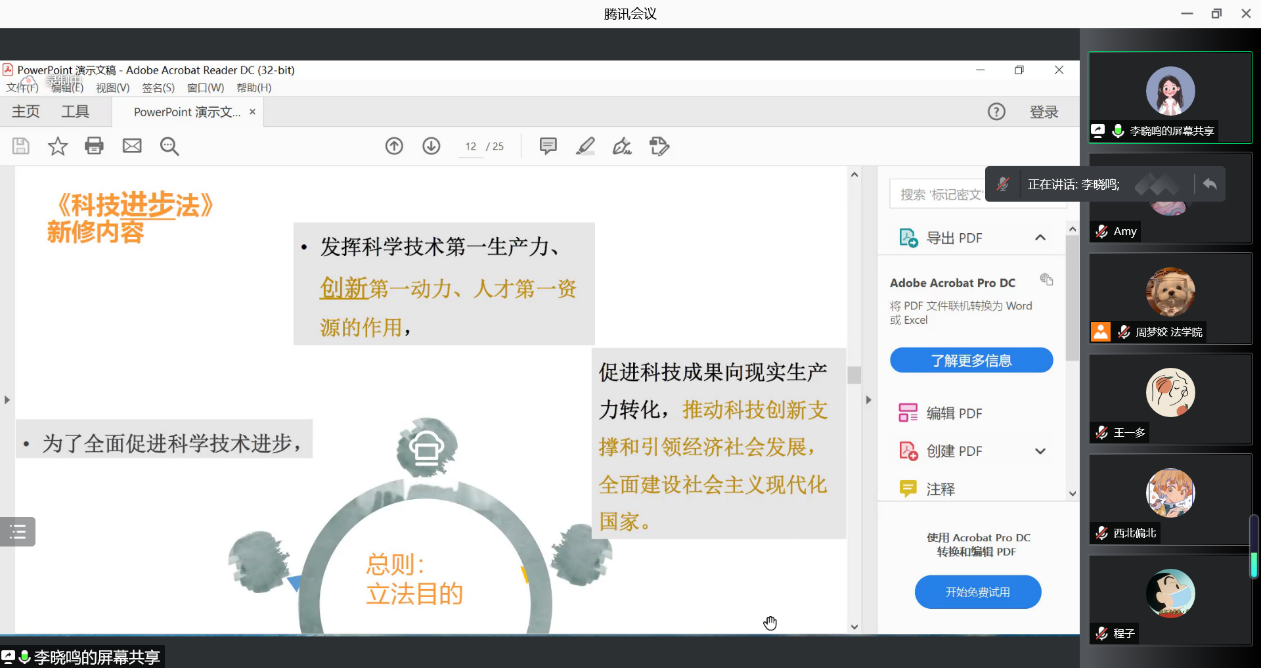2022年1月9日晚上,B体育官网平台B体育官网平台知识产权研究中心李晓鸣副教授对修订后的科技进步法的背景、新旧科技进步法的内容进行了对比,并对新科技进步法的亮点进行了详细介绍。同学们表示收获颇丰。