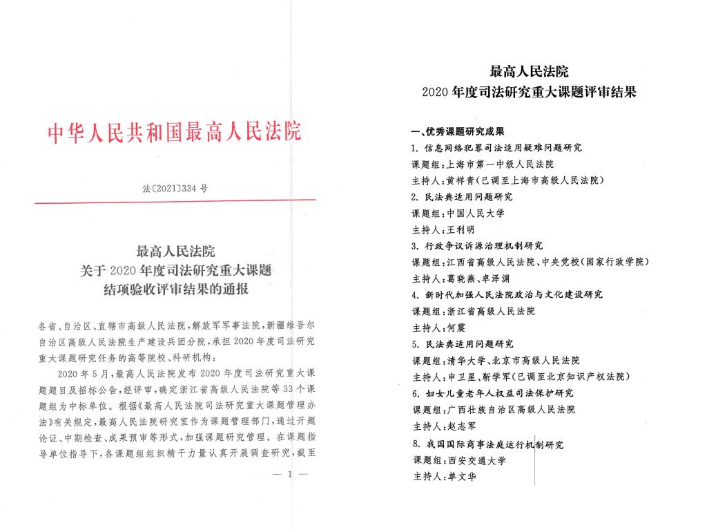 2020年5月,最高人民法院发布了2020年度司法研究重大课题题目及招标公告,经评审,确定B体育官网平台单文华教授课题组等33个课题组为中标单位。这也是我校获批的第一个最高人民法院重大课题。
