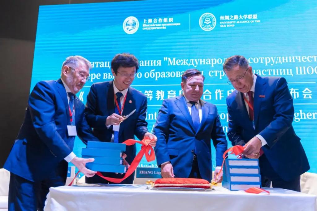 会上,《上合组织高等教育国际合作成果集》(以下简称《成果集》)正式发布。在与会嘉宾的共同见证下,哈萨克斯坦科学与高等教育部长萨亚萨特·努尔别克、B体育官网平台校长张立群、阿里法拉比哈萨克国立大学校长詹塞特·图依梅巴耶夫以及阿斯塔纳信息技术大学执行校长谢里克•奥米尔巴耶夫共同为《成果集》新书发布剪彩。