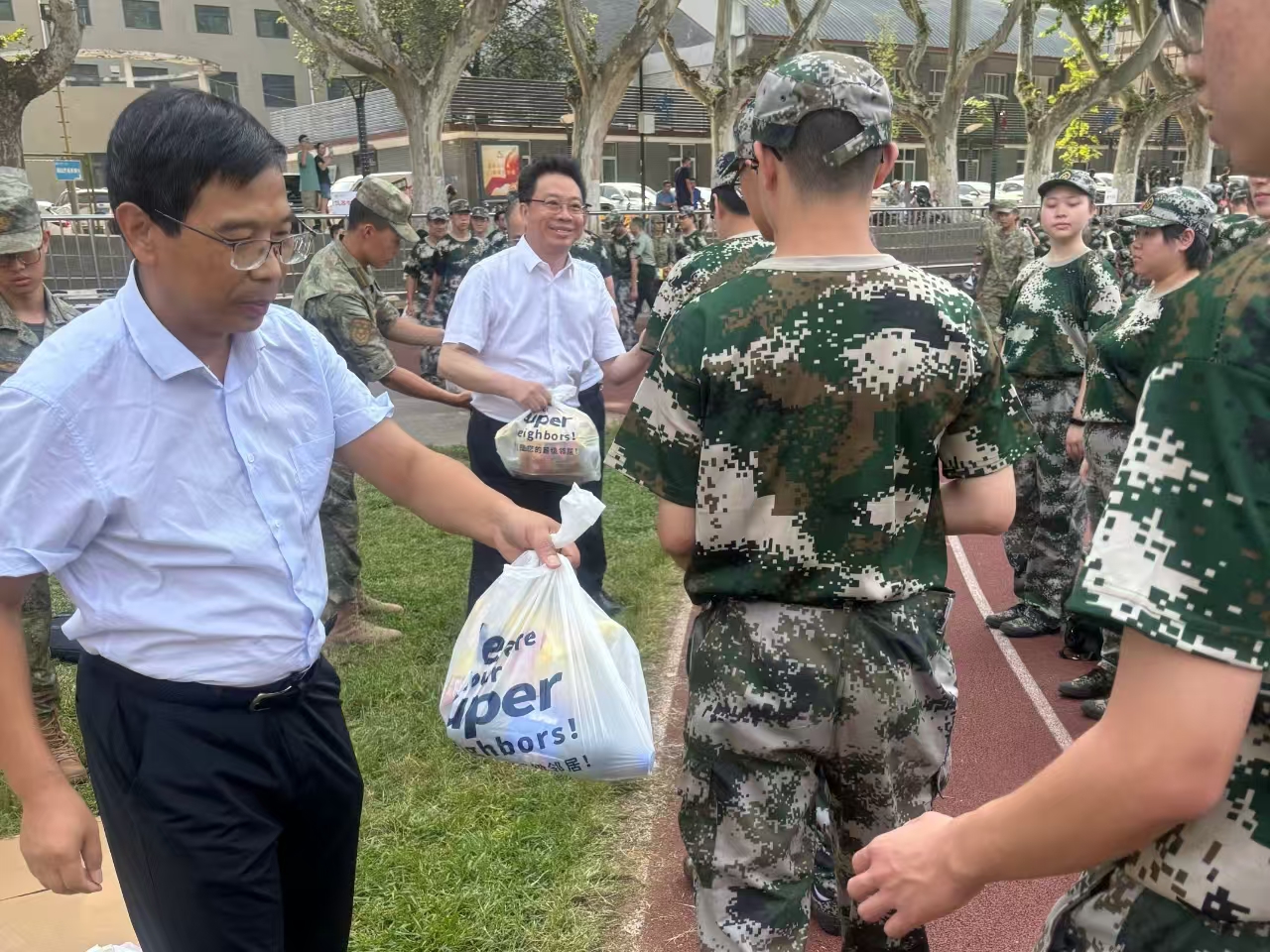 之后,单文华院长、王保民书记和丁卫副院长一起为教官、指导员和同学们送上“慰问大礼包”,逐一将慰问品送到教官、指导员和同学们的手中,给炎炎夏日带来缕缕清凉。