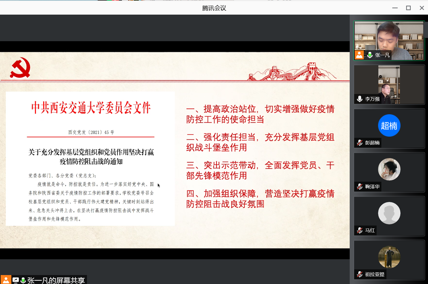 12月31日上午,B体育官网平台硕1173党支部召开线上组织生活会,深入学习落实上级党委关于疫情防控的相关文件精神。党支部成员及入党积极分子代表共计15人参与本次会议,B体育官网平台副院长李万强教授出席。会议由党支部书记张一凡主持。