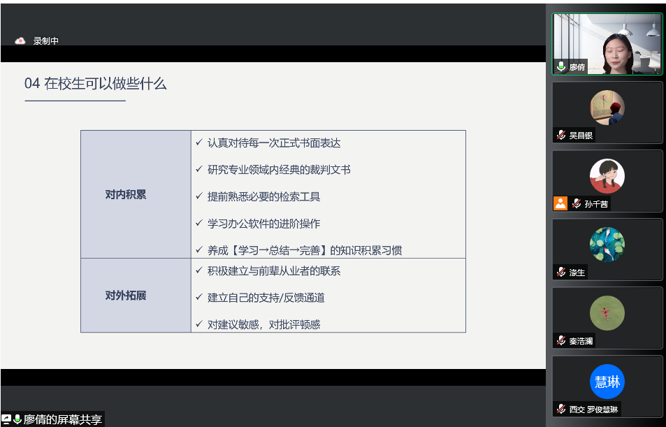 廖倩学姐分享了有关律师职业选择的心得,主要包括获取招聘信息的渠道、律师事务所的选择、律所对求职者的偏好和在校生现阶段准备工作四个方面的内容。在此基础上,学姐分享了个人实践经历要与律师团队业务相契合,具备法律文书基本素养和格式规范、提前熟悉必要的检索工具等求职方面的实用建议。
