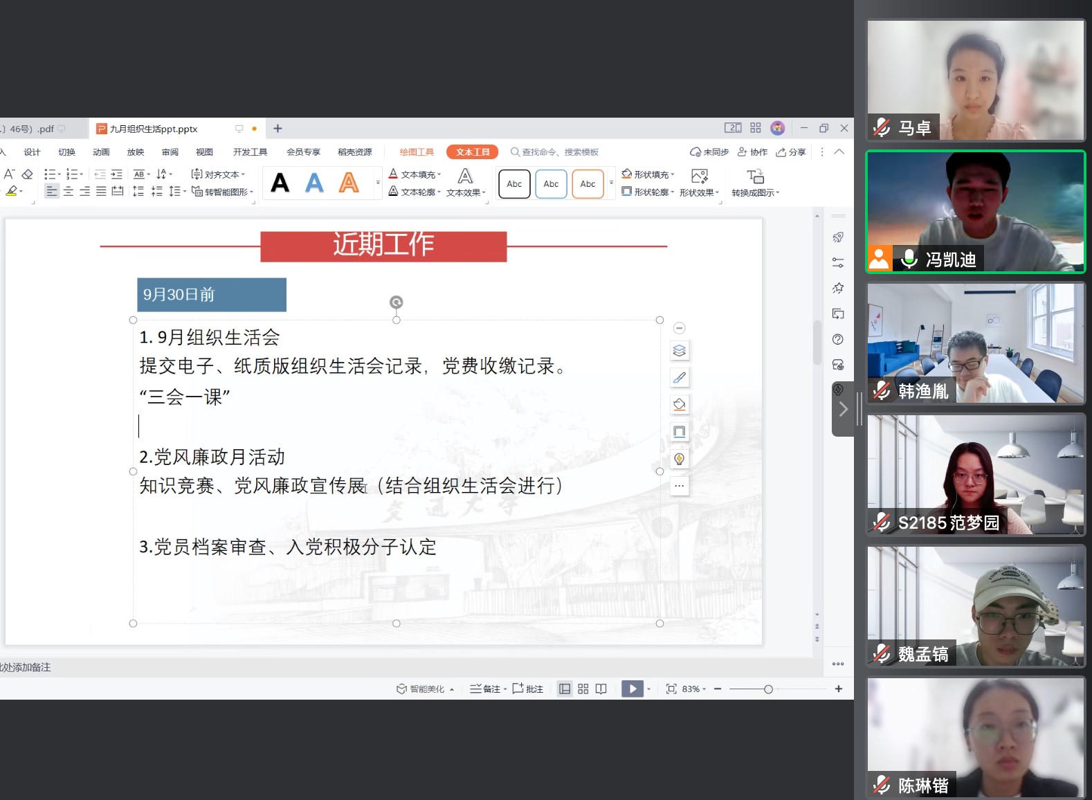 2022年9月27日晚,B体育官网平台硕2185党支部举行了九月组织生活会,也是本支部的第一次会议。根据疫情防控相关要求,本次组织生活会采用线上的方式进行。本次会议由党支部书记冯凯迪主持,党员及入党积极分子共15人参加会议。