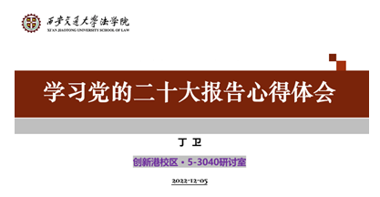 首先,由丁卫副院长进行党的二十大报告精神宣讲。丁副院长对党的二十大报告的重点内容进行了逐章解读,并结合其分管的本科教学和科研管理工作谈了贯彻落实党的二十大报告精神的心得体会。在介绍“开辟马克思主义中国化时代化新境界”一章的内容时,他结合自身分管的本科生培养方案修订这一工作,深刻阐释了坚持和发展马克思主义应该同中国具体实际相结合这一要求的重要意义,指出新时代文科学生的培养不应一味照搬西方模式,而应立足中国教育实际,坚持中国大学教育特色。他重点解释了党的二十大报告中提到的“中国式现代化”这一概念,并结合法学重点期刊的征稿信息鼓励学院教师和硕博士研究生围绕“中国式现代化的法治内涵”这一主题开展研究,发表高质量学术论文,破解理论难题。针对二十大报告中“办好人民满意的教育”这一内容,他对未来法学学科建设的图景进行了展望,并要求各研究中心要仔细对照报告中提出的要求,开展跨学科复合人才培养,为国育才。丁副院长在宣讲中尤其注重将理论学习与教工和研究生的科研、业务工作紧密结合,强调将学习贯彻党的二十大报告精神的行动落实到课题申报上和科学研究中,将学习的心得体会转化为学术成果,围绕党的二十大报告中提出的一系列理论问题加强研究,贡献法治智慧。